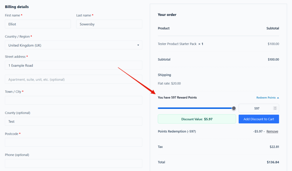 Con esta opción activada, los clientes pueden canjear fácilmente sus puntos por un descuento en el carrito o en la página de pago.